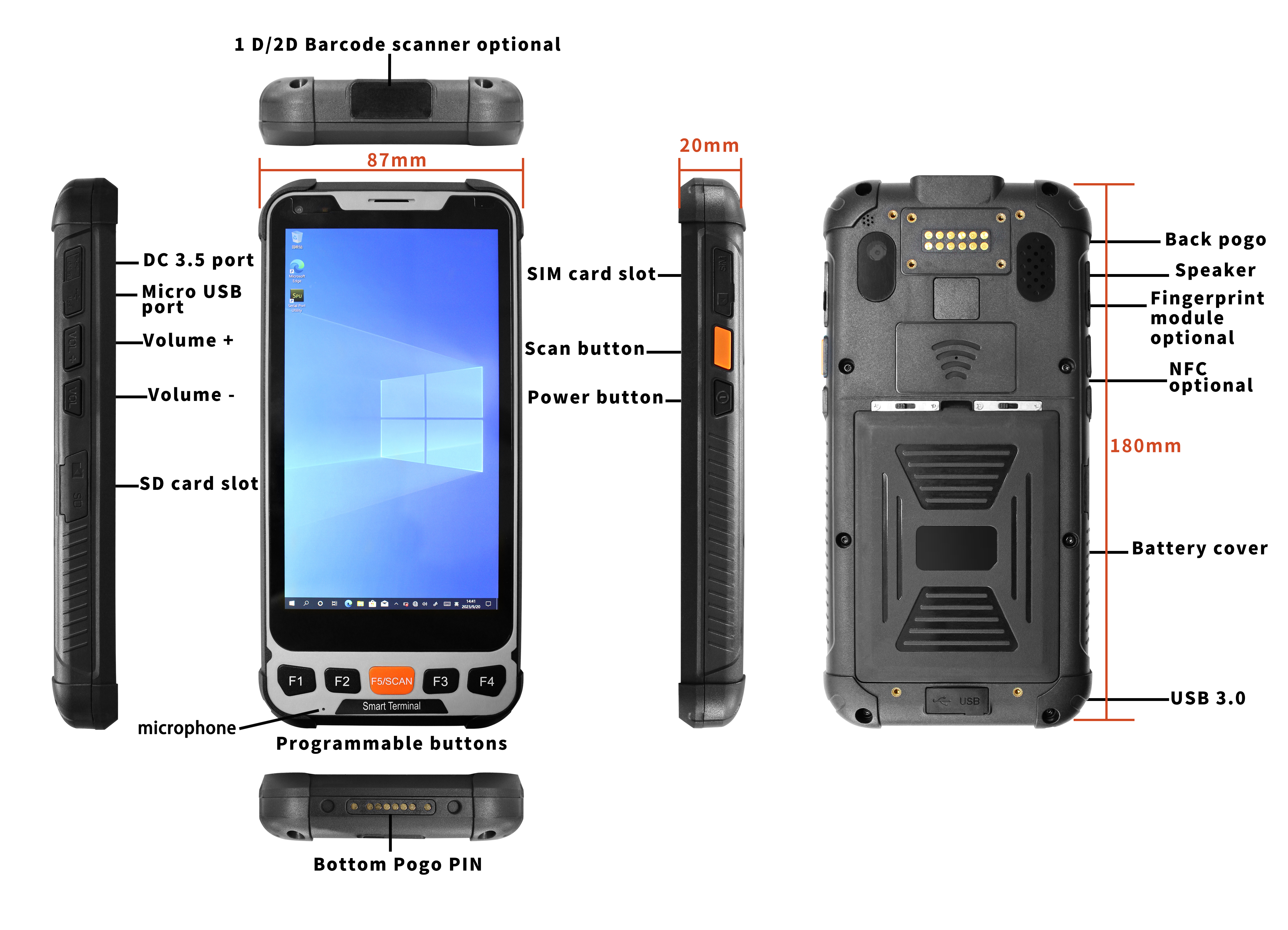 SH5-W는 인텔 체리 트레일 Z8350 쿼드 코어 프로세서(1.44GHz, 터보 최대 1.92GHz)로 구동되는 5.5인치 견고한 핸드헬드 터미널로 Windows 10 Pro(홈/IoT 옵션)를 실행합니다. 4GB/64GB 스토리지, 5.5인치 1080x1920 IPS 디스플레이(400니트), 2MP 전면/5MP 후면 카메라, 5000mAh 3.8V 배터리(19.0Wh), 4G LTE 연결(EG91-EX/NAX 모듈), Intel WiFi 6 3165 및 Bluetooth 4.2. IP65 먼지/방수, 1.2m 낙하 저항, 옵션 UHF RFID(1-5M 범위) 및 지문 센서 포함