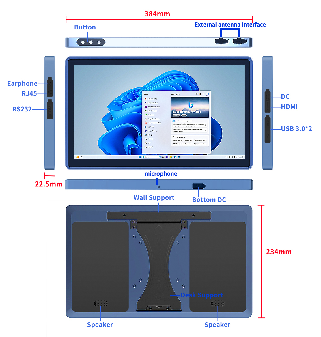 DC 12V 3A ∮4.0mm 이중 전원 인터페이스 ×2;HDMI Type A ×1;USB Type-A 3.2 Gen1 ×2 USB Type-C 3.2 Gen1 ×1(PD 충전、DP 영상 출력、데이터 전송、충전 지원);이어폰 잭 ∮3.5mm ×1 기가비트 이더넷(RJ45);RS232(표준 DB9 커넥터) |