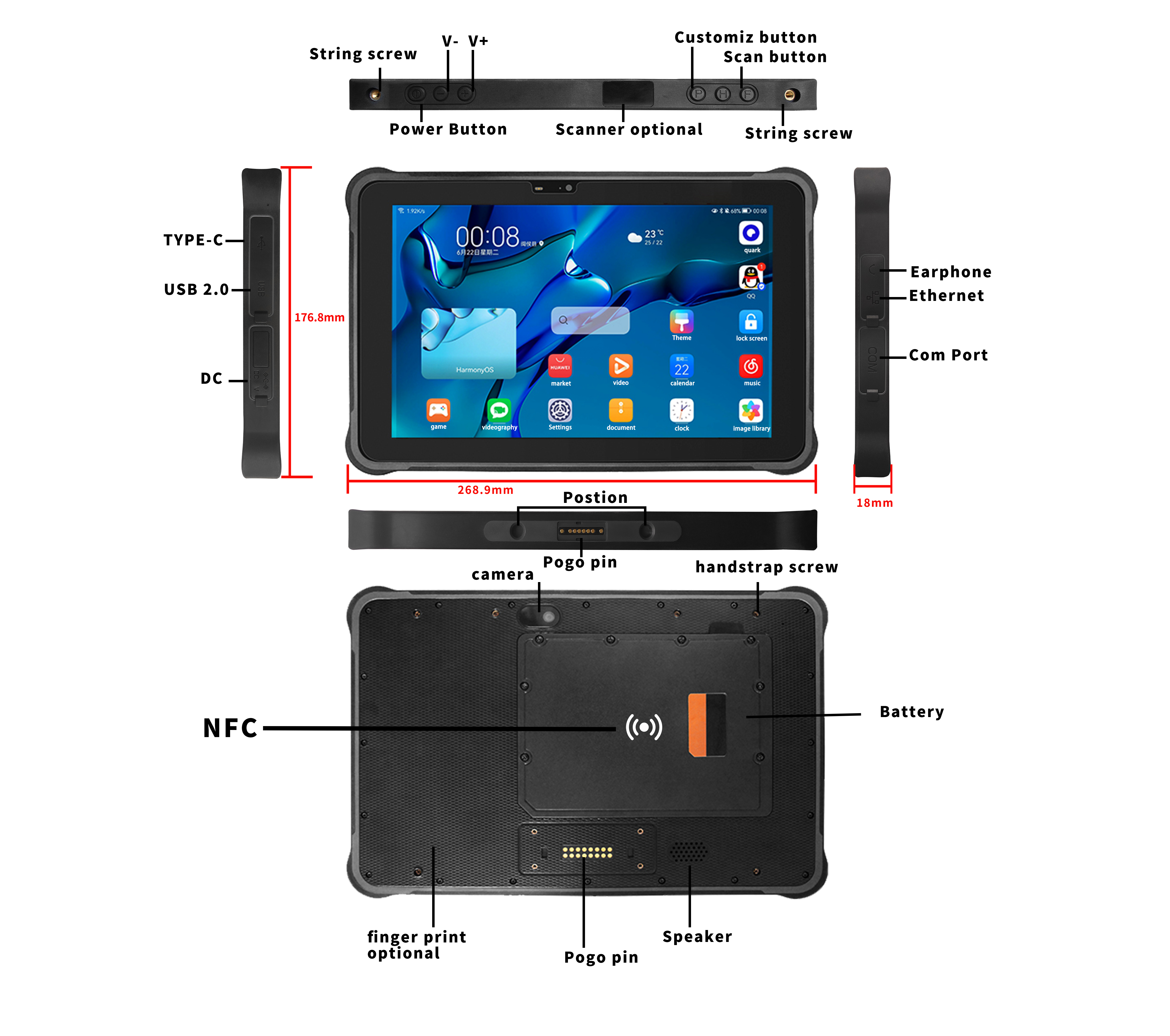 Type-C *1 (OTG); SIM 카드 슬롯*1; TF 카드 슬롯*1; 이어폰*1; DC*1 (3.5×12mm); USB 2.0 *1; RJ45*1; RS232*1 하단 포고핀: USB 2.0; 충전; RS232 후면 포고핀: USB 2.0; RS232 EDP 인터페이스: 예비 인터페이스 |