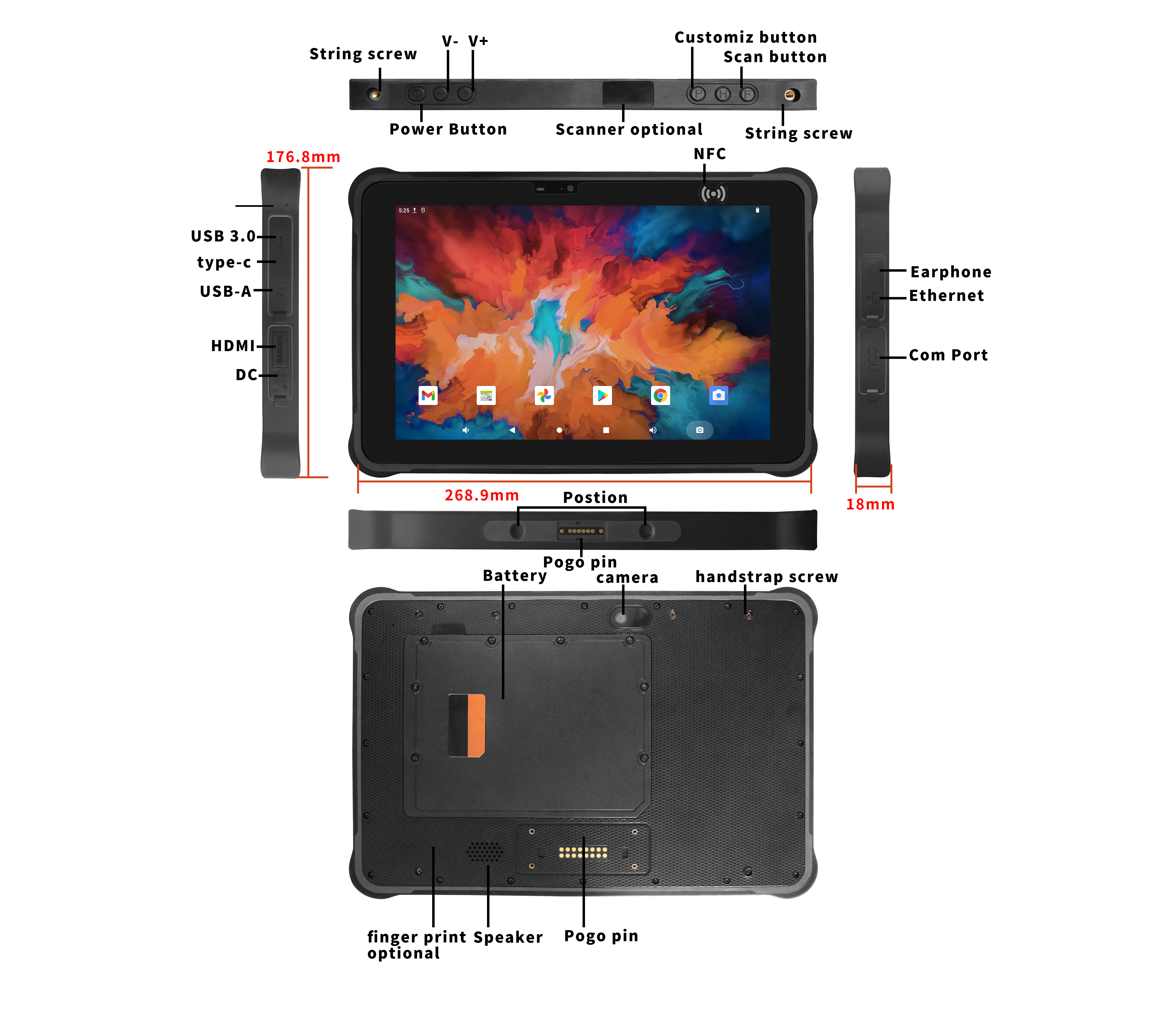Type-C *1 (OTG); SIM 카드 슬롯*1; TF 카드 슬롯*1; 이어폰*1; DC*1 (4.0×15mm); USB-A:USB 2.0 *1+USB 3.0 *1; RJ45*1; RS232*1; HDMI*1 하단 포고핀: USB 2.0; 충전; RS232 후면 포고핀: USB 2.0; RS232 |