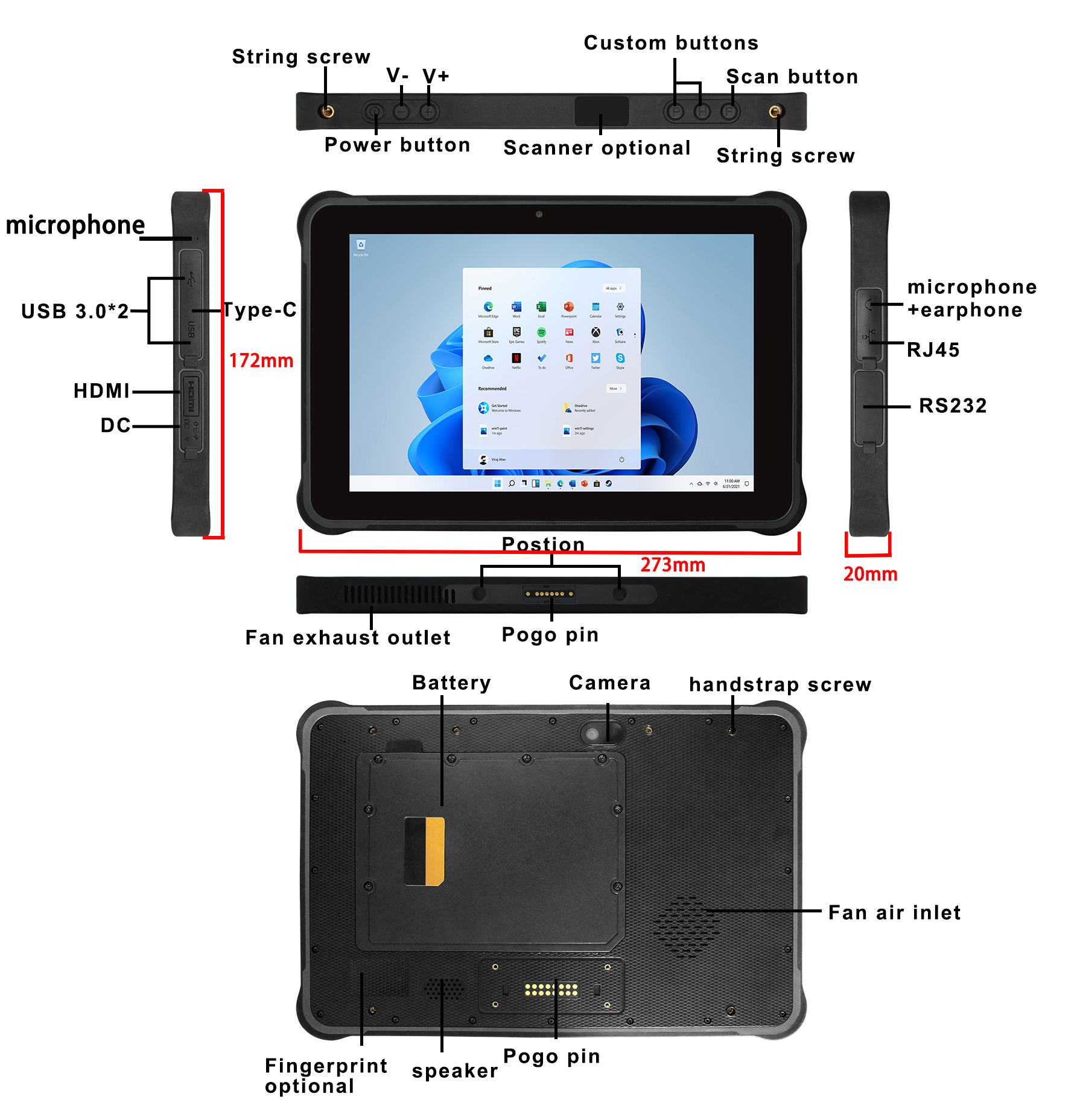 | 입출력 인터페이스 | DC×1(4.0×15mm); HDMI Type A×1; USB Type-A: USB3.2 Gen1×2; USB Type-C: USB3.2 Gen1×1(PD/DP/데이터/충전); 이어폰 잭: ∮3.5mm×1; 기가비트 RJ45; RS232(DB9) 하단 포고핀: USB 2.0; 충전; RS232 후면 포고핀: USB 2.0; RS232 |