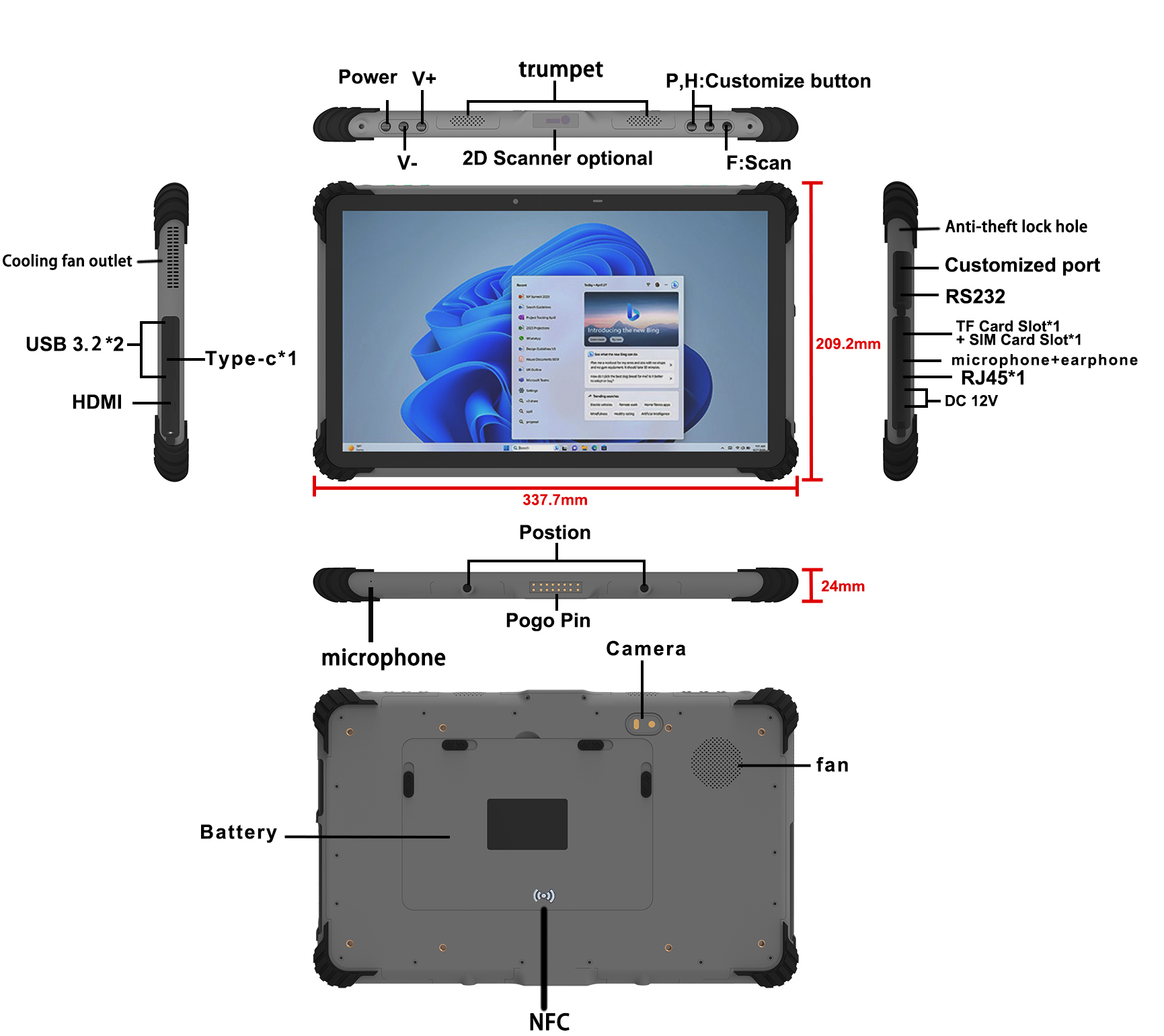 Windows 11 Pro 시스템이 장착된 견고한 태블릿: 강력한 Intel i5 데카 코어 프로세서, 긴 배터리 수명을 가진 13.3인치 HD 화면, 효율적인 4G/5G/WiFi 6 연결, IP65 보호 및 낙하 방지 설계는 복잡한 시나리오, 내장 냉각 팬 및 대용량 스토리지에 적응하고 사용자 지정을 지원하여 물류, 산업 및 기타 분야의 전문 운영을 위한 신뢰할 수 있는 도구입니다.