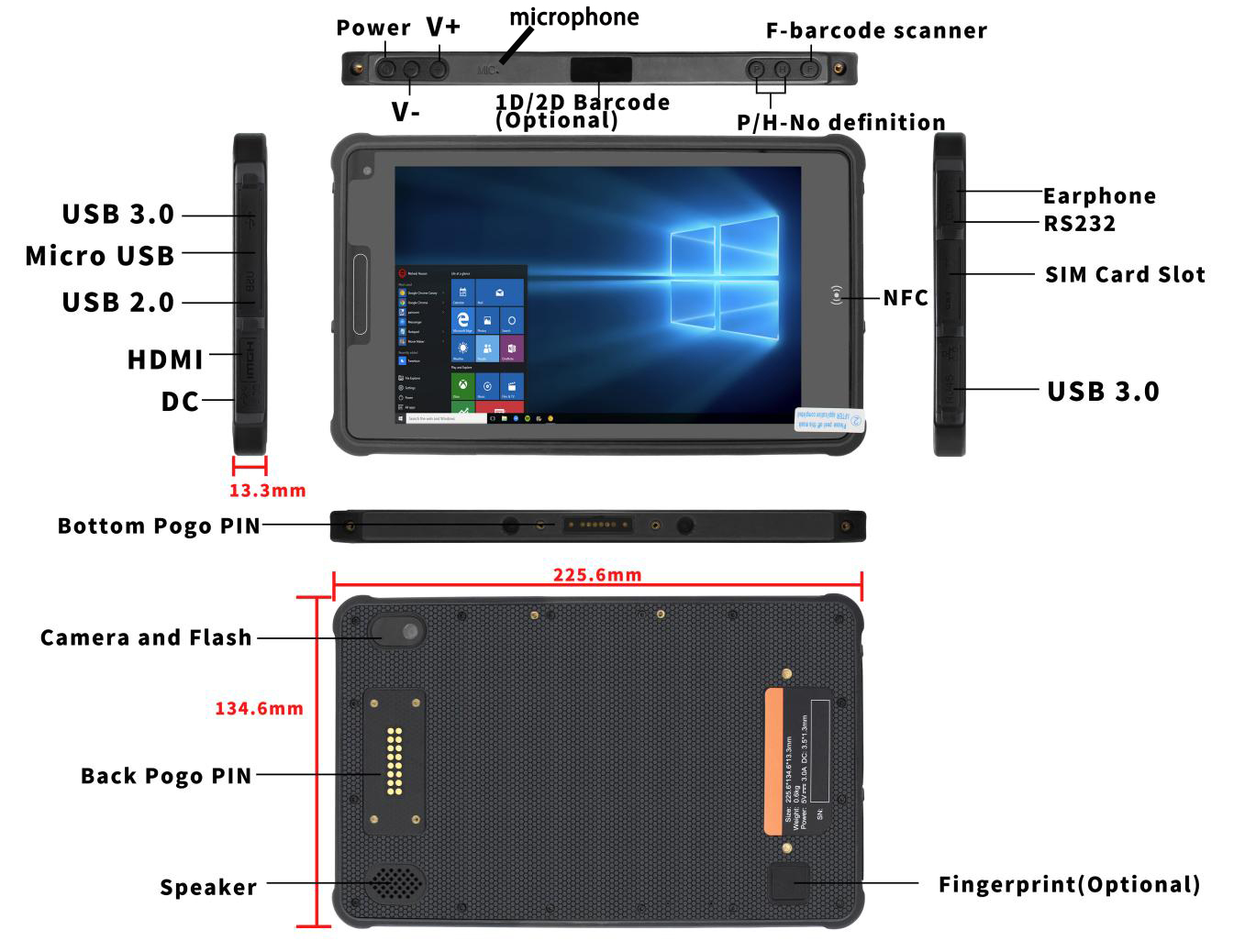 HDMI*1, SIM 카드 슬롯*1, RS232*1(미니 USB), 이어폰 포트*1, DC 전원 포트*1(3.5×12mm), USB-A: USB 3.0×2 + USB 2.0×1 하단 pogopin: USB 2.0; 충전; RS232 후면 pogopin: USB 2.0; RS232 |