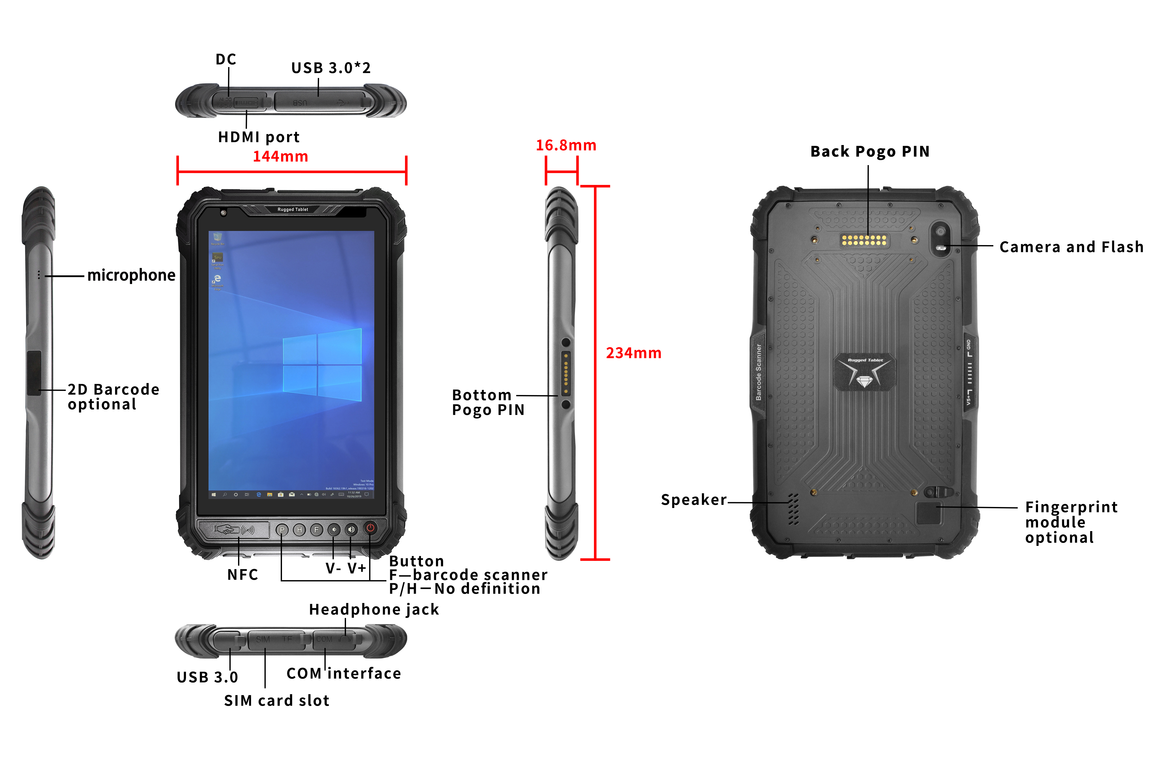 HDMI×1, SIM 카드 슬롯×1, RS232×1(미니 USB), 헤드폰 잭×1, DC 전원 잭×1(4.0×15mm), USB 3.0×3 바닥 포고핀(Pogopin): USB 2.0; 충전; RS232 후면 포고핀(Pogopin): USB 2.0; RS232 |