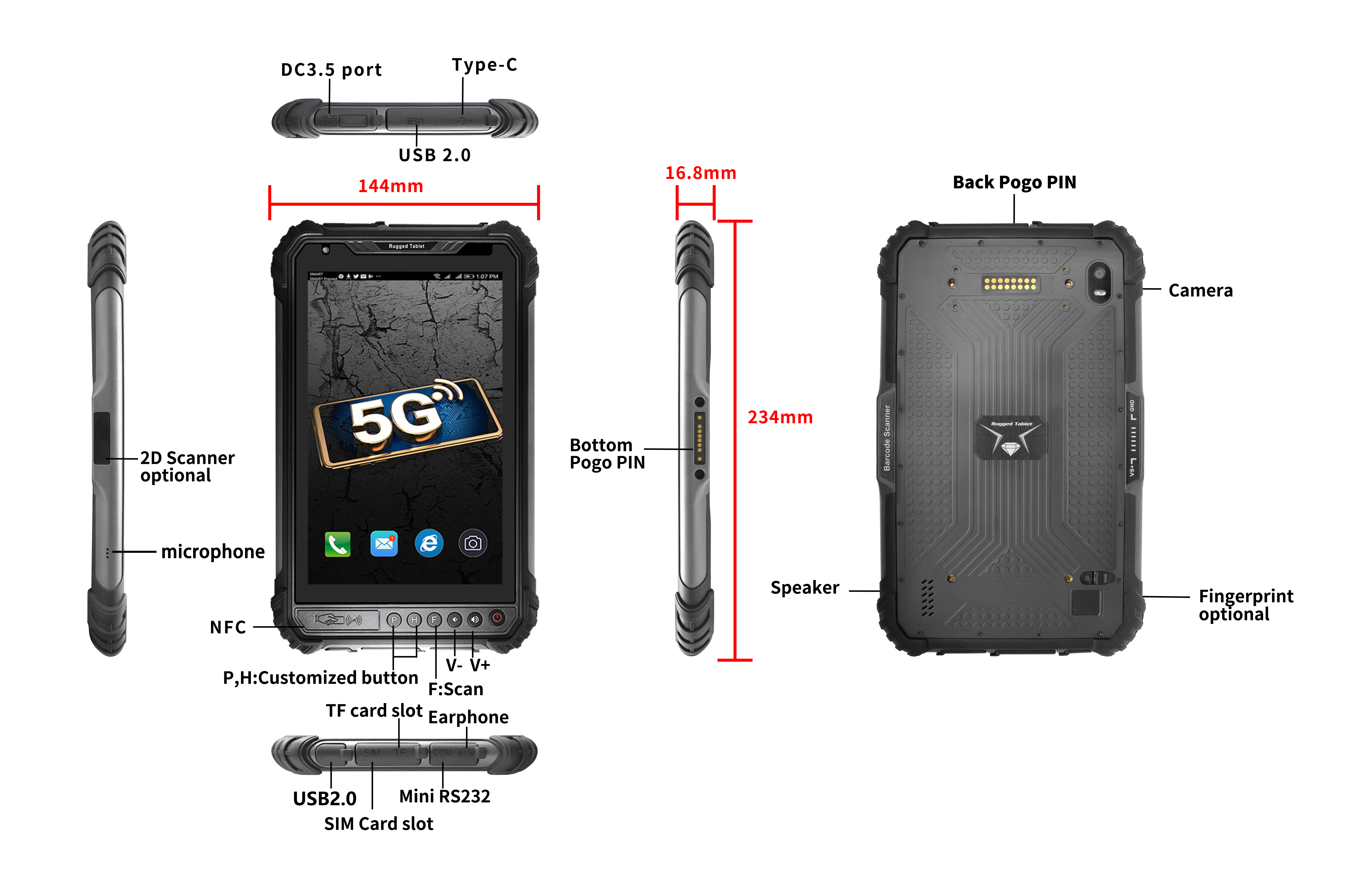 Type-C *1(OTG 지원), SIM 카드 슬롯*1, TF 카드 슬롯*1, 이어폰 포트*1, DC 포트*1(3.5×15mm), USB 2.0 *2, RS232*1(미니 USB) 하단 포고핀: USB 2.0; 충전; RS232 후면 포고핀: USB 2.0; RS232 |